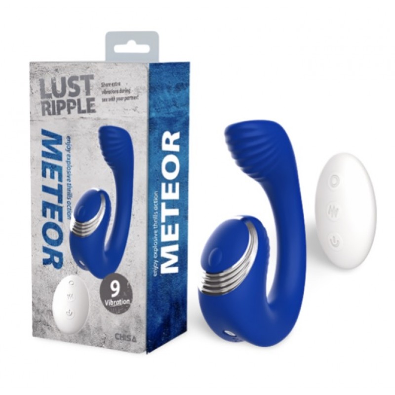 Вагінальний вібратор для точки G з відростком для клітора синього кольору з пультом керування Chisa
