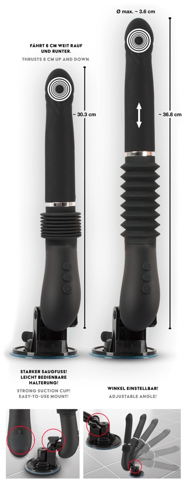 Віброударна сила з додатковою довжиною 6(!) см! Ударний вібратор RC Fucking Machine 2.0 від You2Toys зі знімною, регульованою по кутку нахилу основою на присосці, яка міцно та надійно прилипає до будь-якої гладкої поверхні для задоволення без рук. 7 режимів вібрації та 3 режими удару можуть керуватися окремо і в комбінації з бездротовим пультом дистанційного керування (із замком-ключом) – навіть вашим партнером. З м'якою на дотик поверхнею по всьому периметру, бархатистий силіконовий стовбур з вираженою головкою забезпечує безтурботне, плавне задоволення від поштовхів. Вібратор та пульт дистанційного керування перезаряджаються - USB-кабель для заряджання входить до комплекту. Загальна довжина від 30,3 см до 36,8 см. Довжина вставки 15 см, від 3,1 см до 3,6 см. Вага 323 г. Силікон, поліуретан, ABS.
