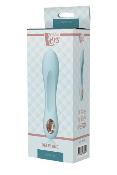 Вібратор Delphine з колекції Aquatic від Dream Toys має стильні кнопки кольору золотого золота, міцну форму і м'який наконечник. Він виготовлений з двошарового силікону і АБС, водонепроникний і безпечний для тіла IPX7, не містить фталатів і латексу. Одна сторона вібратора текстурована, інша-гладка з характерними краями. Завдяки подвійному шару силікону він має подвійну щільність: м'який зовні і більш жорсткий всередині. Потужний двигун Delphines пропонує 7 режимів вібрації і 3 швидкості. Управління здійснюється двома кнопками на підставі. Він заряджається за допомогою USB-кабелю. Розміри: довжина 17,0 см, ширина 3,6 см, Глибина 2,6 см.