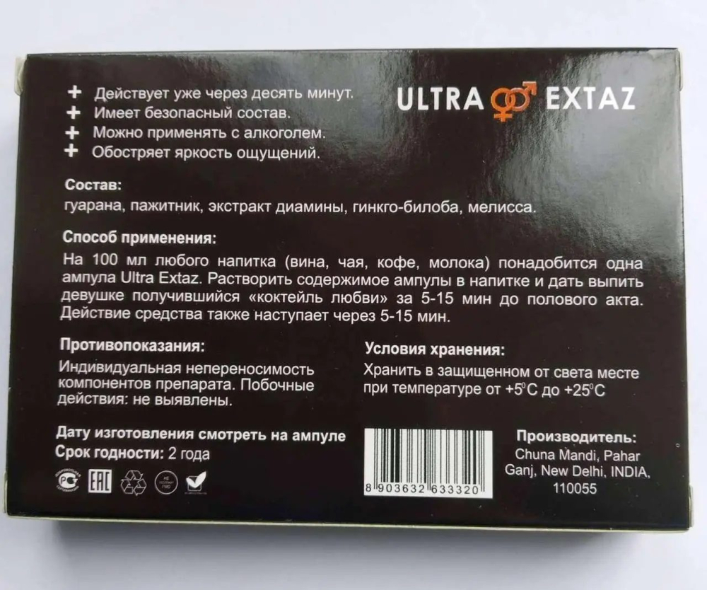 Мелісса - активізує процеси кровообігу та мікроциркуляції в області жіночих статевих органів. Підвищує чутливість ерогенних зон, робить яскравішими відчуття при інтимній близькості. Багаторазово підвищує можливість досягнення оргазму. Гуарана - славиться своїми яскраво вираженими судиннорозширювальними властивостями, стимулює досягнення стану статевого збудження. Активізує лібідо. З давніх-давен використовується як природний афродизіак, що викликає збудження. Гінкго-білоба - активізує процеси кровотоку. Має розслаблюючу дію на судинні стінки. Дарує швидкий стан сексуального збудження, повертає інтерес до інтимного життя. Пажитник - це природний аналог жіночого статевого гормону-естрогену, відповідального за лібідо, чуттєвість і сексуальність. Екстракт Діаміни - багаторазово посилює приплив крові до області жіночих статевих органів. Працює за принципом природного афродизіаку. Препарат не викликає звикання, не має вікових обмежень та побічних дій. Оптимально збалансований натуральний склад приносить виняткову користь жіночому здоров'ю загалом та органам сечостатевої системи зокрема. Застосування: Розробники продукту подбали і про те, щоб його застосування було максимально простим та зручним. Послідовність дій така: На 100 мл будь-якого напою (вина, чай, кава, молоко) знадобиться одна ампула Ultra Extaz. Розчинити вміст ампули в напої і дати випити дівчині коктейль кохання, що вийшов, за 5-15 хвилин до статевого акту. Дія засобу також настає через 5-15 хвилин. Кількість в упаковці: 5 ампул 500 мг.