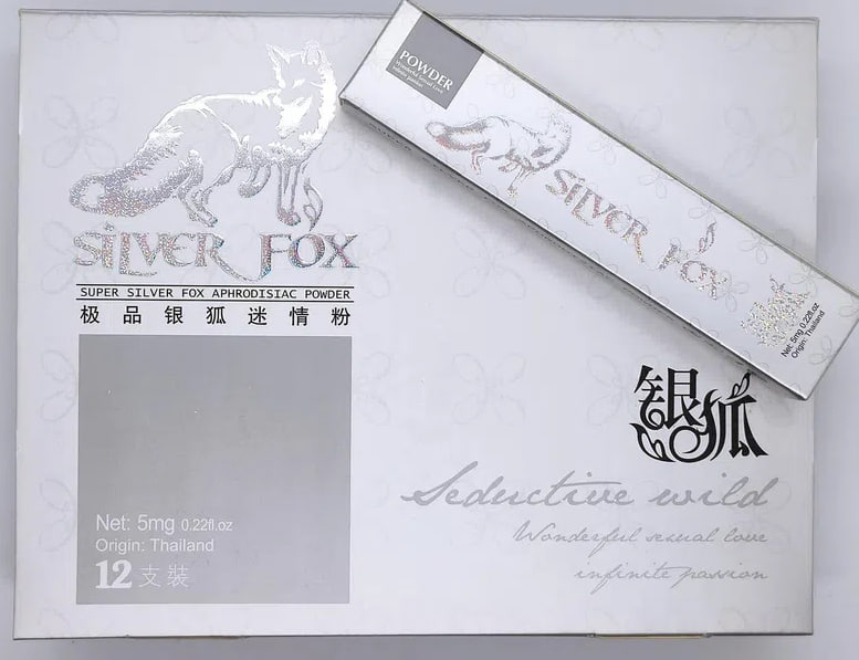 Срібна лисиця - Silver fox – препарат для підвищення сексуального лібідо жінок, найсильніший жіночий збудник. Завдяки складу з натуральних компонентів, збудження відбувається швидко та природно. В результаті прийому препарату у жінки збільшується вагінальна секреція, звужуються стінки піхви, набухають статеві губи, груди і соски. Вже через 15-20 хвилин після прийому жінка починає відчувати сексуальне бажання. Препарат являє собою розчинний у рідині порошок, без смаку, кольору та запаху. Можна поєднувати з алкоголем. Показання для застосування: зниження лібідо у жінок, відсутність сексуального бажання, низька сексуальна активність, сухість піхви. Приймати за 15-20 хвилин до статевого акту, розчинивши вміст пакетика в будь-якому напої. Протягом доби можна приймати лише одну дозу препарату.