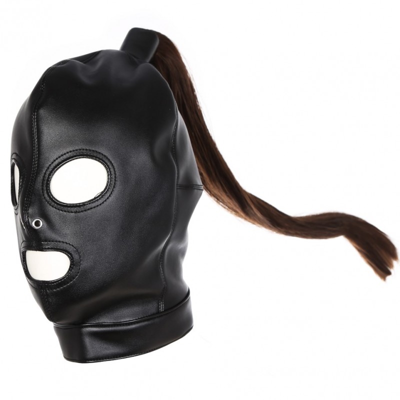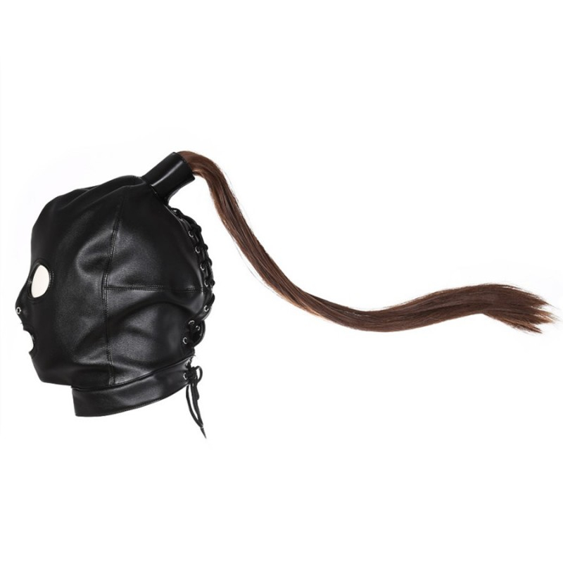 Характеристики Маска на шнурівці з вирізами для очей та рота з перукою чорного кольору Bdsm4u