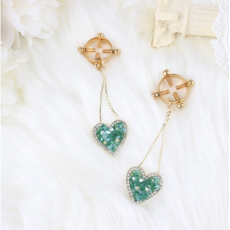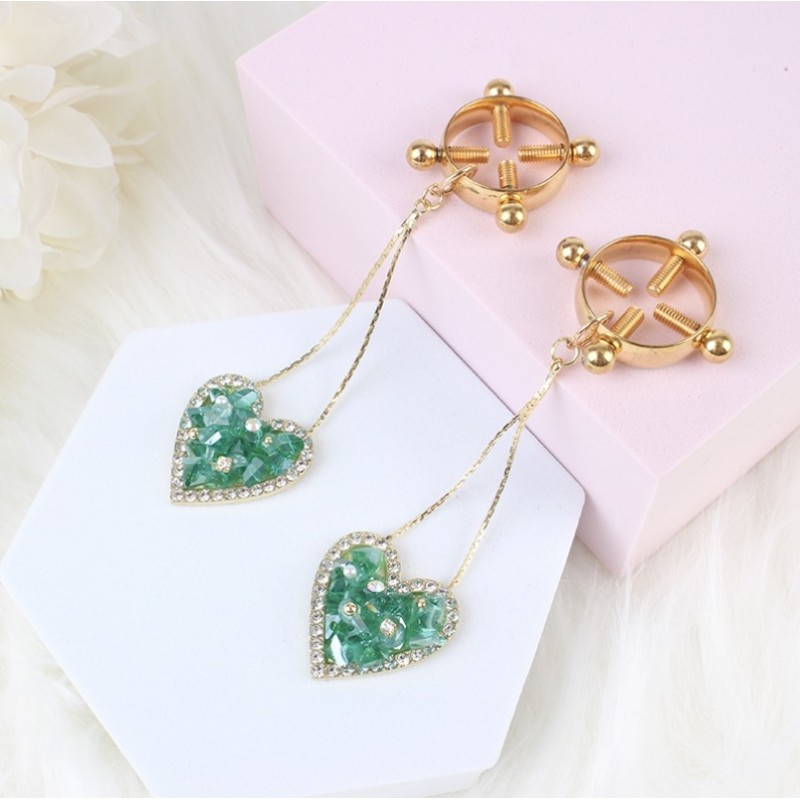 Затискачі для сосків БДСМ із силіконовими наконечниками та прикрасами зеленими сердечками Love Diamond Cnt