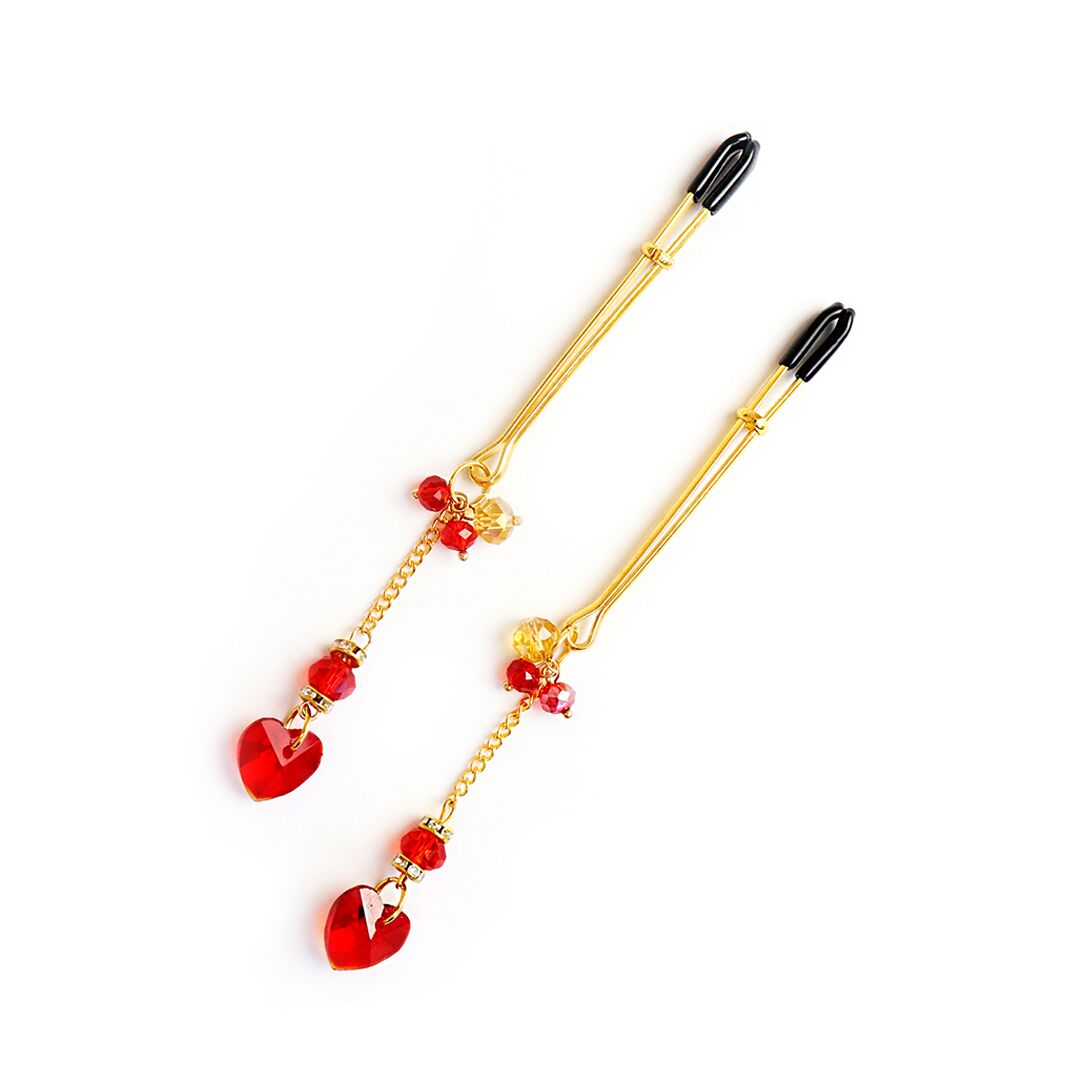Затискачі для сосків БДСМ золотистого кольору з червоними сердечками камінцями Art of Sex