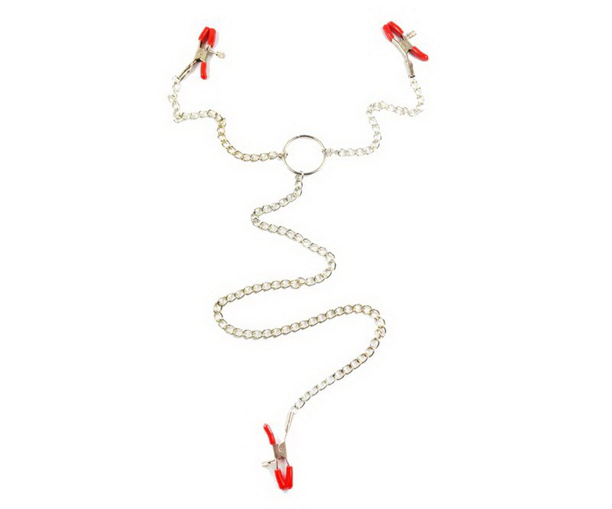 Затискачі для сосків та клітора червоного кольору БДСМ на сріблястому металевому ланцюжку Scappa
