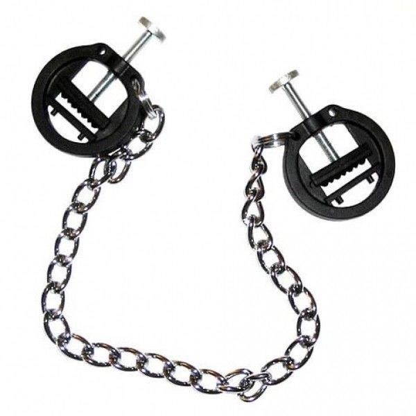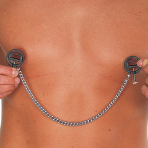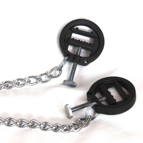Чорні пластикові прес-затискачі для сосків, за допомогою регульованих металевих гвинтів і пластикових кріплень, безумовно, дають цікаві іінтенсивні відчуття. Вони з'єднані один з одним довгим металевим ланцюгом, який може бути використаний для додавання додаткових обважнень.