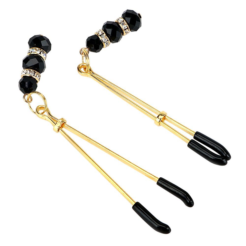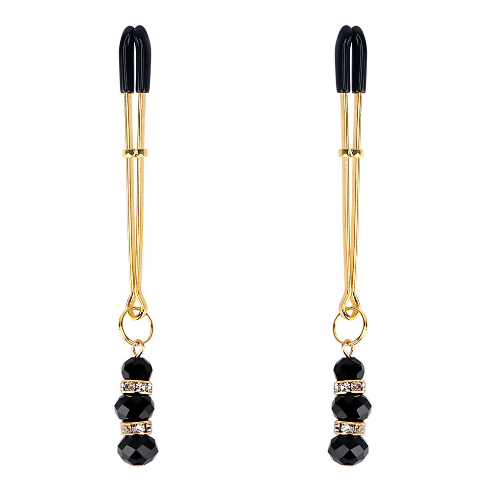 Поєднання золотого металу і чорних сяючих намистин, що звисають на грудях- роблять цю прикрасу справжнім витвором мистецтва. Аксесуар виглядає на грудях дуже витончено та зі смаком, партнер просто не зможе відірвати очей! На кінчиках металевих затискачів розташовані спеціальні силіконові насадки для безболісного та безпечного використання. Сила затискання регулюється петелькою, яку ви підтягуєте для затискання. Загальна довжина виробу: 110 мм. Довжина затиску: 70 мм. Довжина прикраси: 40 мм. Колір: золотий метал, чорні намистини