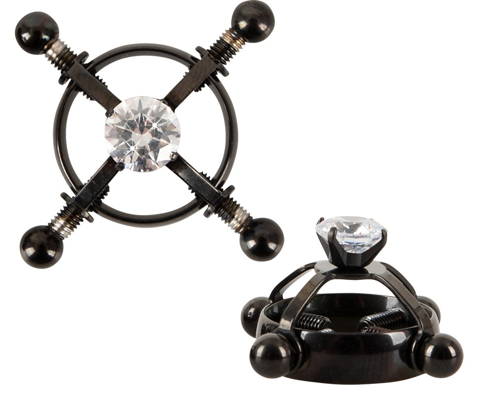 Затискачі для сосків із гвинтами та стразами БДСМ чорного кольору Bad Kitty