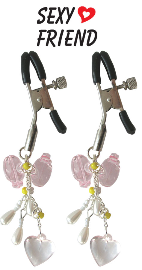 Внеси в своє сексуальне життя гострих відчуттів! Спробуй затискачі на соски з серії "Sexy Friend". Інтимний аксесуар простий у використанні. За допомогою спеціального механізму можна регулювати силу стиснення. Декоративні елементи рожевого кольору прикрасять тіло. Виріб виготовлено з металу і покрито спеціальними пом'якшуючими насадками. Для більш яскравих емоцій рекомендується попередньо нанести на соски збудливий лубрикант. До і після кожного застосування необхідно використовувати Очищуючий засіб для виробів інтимного призначення.