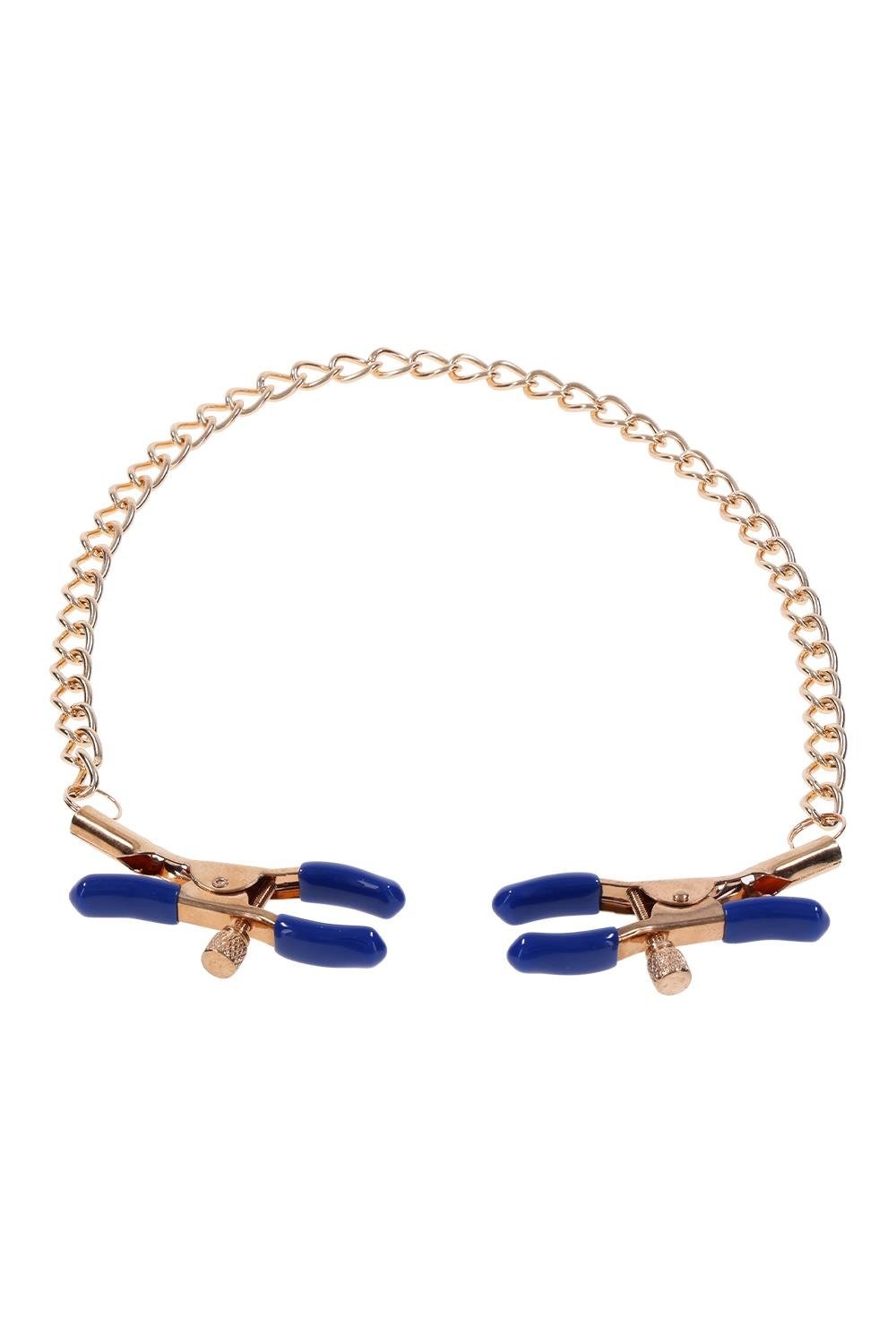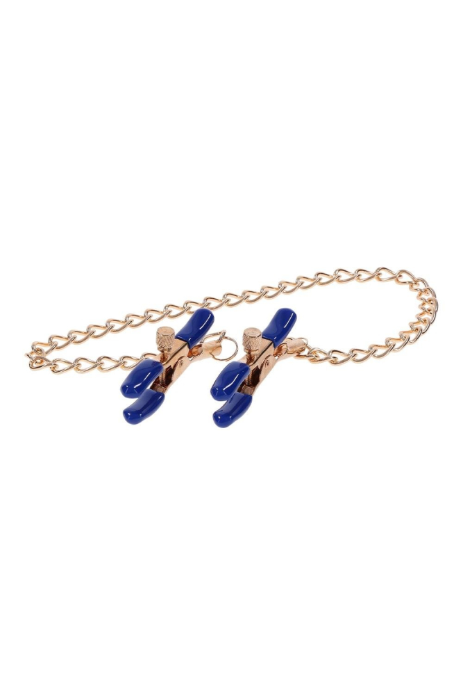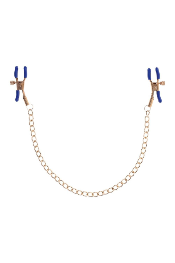 Эти изысканные зажимы оснащены золотой цепочкой и яркими синими пластиковыми наконечниками, сочетающими элегантность с ноткой дикой игривости. Идеально подходят для новичков в БДСМ или опытных энтузиастов, регулируемые винты с накатанной головкой позволяют контролировать давление, обеспечивая индивидуальный опыт.