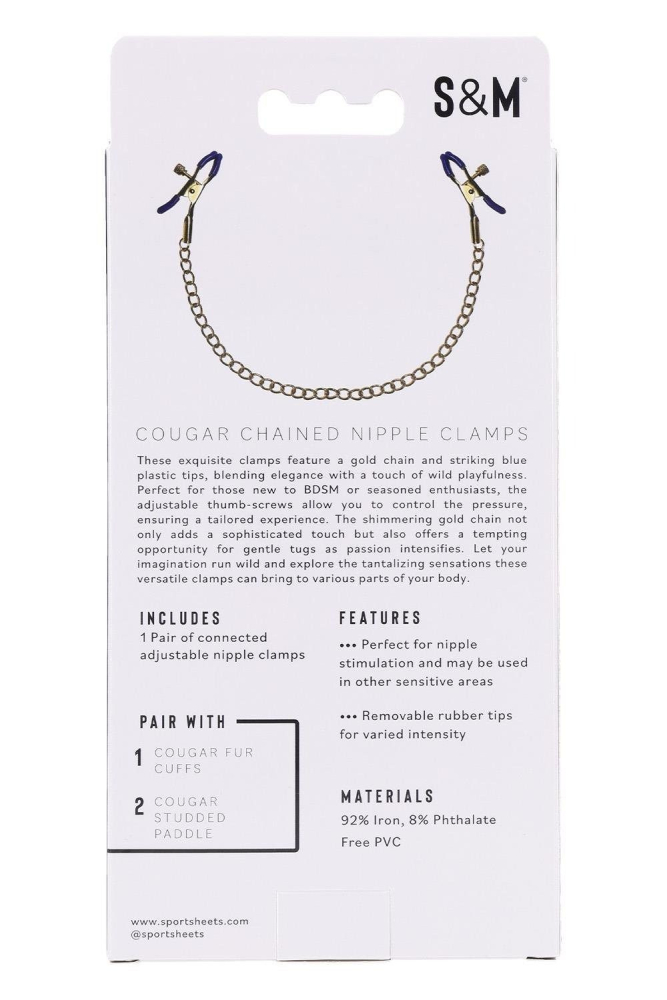 Золотистые зажимы для сосков Sex & Mischief Cougar Chained с синими наконечниками