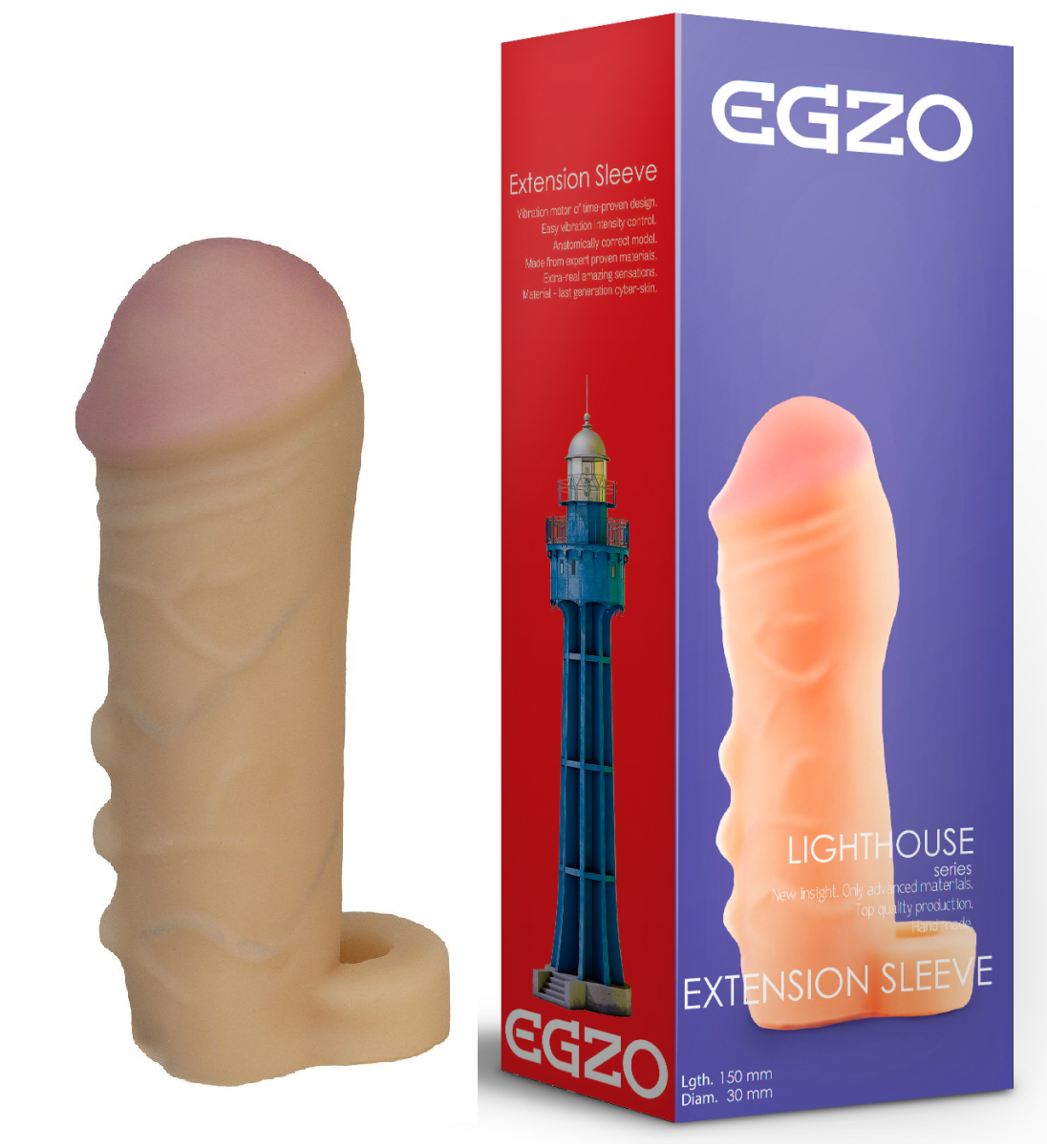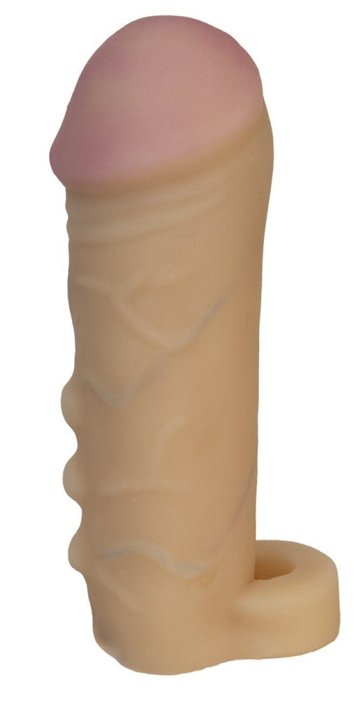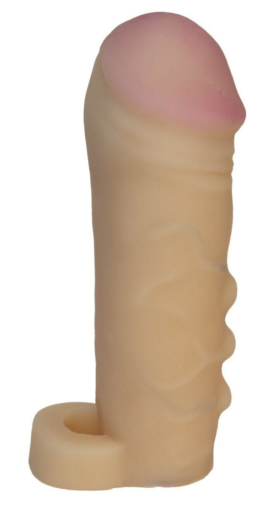 Удлиняющая насадка-презерватив из "киберкожи" увеличивает размер полового члена в толщину на 60% и длину 5 см. Специальное кольцо удерживает насадку за яички и предотвращает соскальзывание.