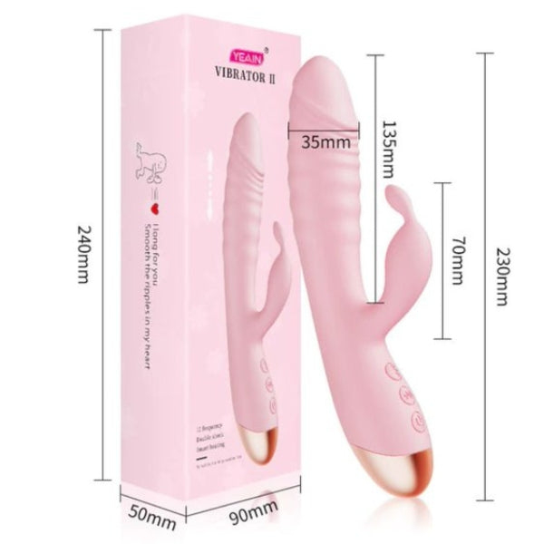 нежном цвете. Сильные два мотора работает независимо друг от друга. Вагинальная головка что движется вперёд-назад даёт вам возможность управлять на пяти разных режимах скорости, а клиторальный отросток имеет 10 режимов вибрации. Головка мягкая, рельефная, реалистичная для усиленной стимуляции влагалища, а отросток в форме головки с хвостиком эластичный, точно прилегает к клитору. Вибратор перезаряжается через usb-зарядку которая идёт в комплекте. Тихий и мощный, удобный в использовании и в уходе.