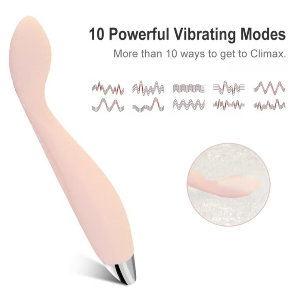 силикона пудрового цвета. Очень приятный и бархатный на ощупь, имеет правильно изогнутую форму и гнущуюся увеличенную головку с рельефом. Активный массаж обеспечат 10 различных режимов вибрации. Время беспрерывной работы 90 минут, а для полной зарядки потребуется 120 минут. USB кабель в комплекте.