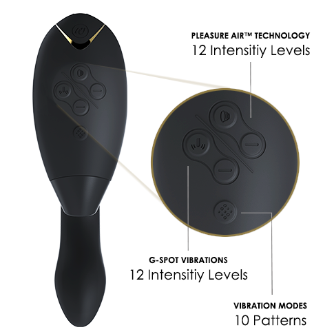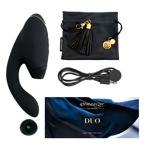 Помимо бесконтактной стимуляции клитора, DUO имеет вибратор в виде изогнутого отростка, для более интенсивной стимуляции точки G, как и в предыдущей модели. Но в этот раз производители немного увеличили головку вагинального отростка, дабы контакт со стенками влагалища и точкой G был более плотный, и в итоге вы получили максимальное удовольствие. Новая версия имеет вибрационный движок от We-Vibe который производит 10 режимов разной чувственной вибрации, варьировать которую вы можете между 12 интенсивностями, и 12 режимов колебаний, их можно регулировать вне зависимости друг от друга. Теперь подобрать свой идеальный режим очень просто, а достижение огразма куда легче. И да, теперь начальный уровень стал еще нежнее и мягче, позволяя растянуть Ваше наслаждение насколько это возможно, ведь уникальная технология Pleasure Air дает 100% гарантии на яркий и неоднократный оргазм, в течение всего 1-2 минут. Вакуумный стимулятор необходимо прижимать к головке клитора, немного раздвинув половые губы. Воздействие очень деликатное, бесконтактное, и что самое главное без натирания. Мягкая съёмная насадка сделана из силикона, и в коробке есть ещё одна немного побольше — для тех, у кого клитор крупный или сильно увеличивается во время возбуждения. Оригинальная функция Smart Silence определяет контакт с телом и включает двигатель только тогда, когда носик для клитора прижата к коже.