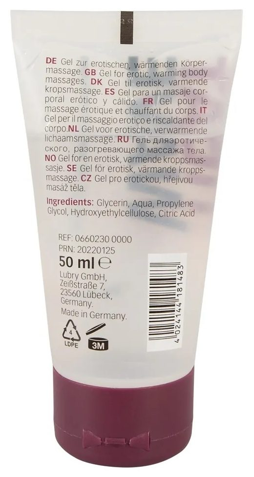 Содержащийся глицерин связывает воду и вместе с трением кожи во время массажа обеспечивает приятное ощущение тепла, которое можно даже усилить легким дыханием на него.