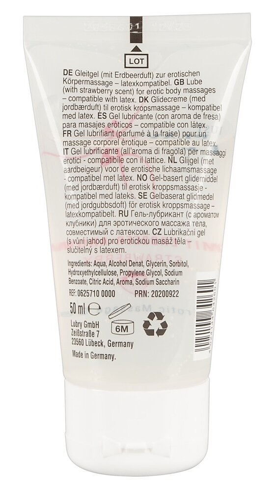 • Массажный гель для эротического массажа тела - Just Play Strawberry подходит для чувственного и эротического массажа всего тела. Однако это не проблема, если все станет немного сложнее, потому что массажный гель совместим с латексом.
