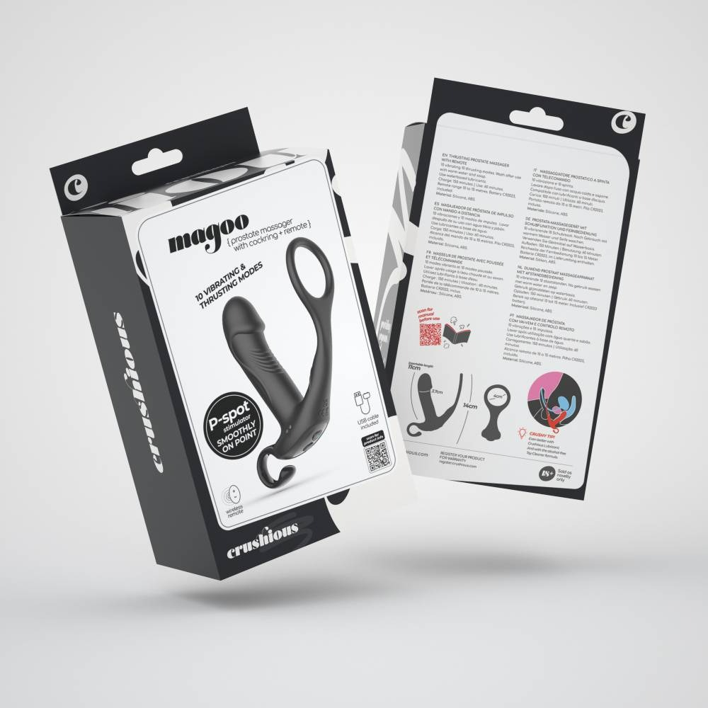 Массажер простаты с фрикциями, с эрекционным кольцом Crushious Magoo с пультом, черный, 14 х 3.7 см