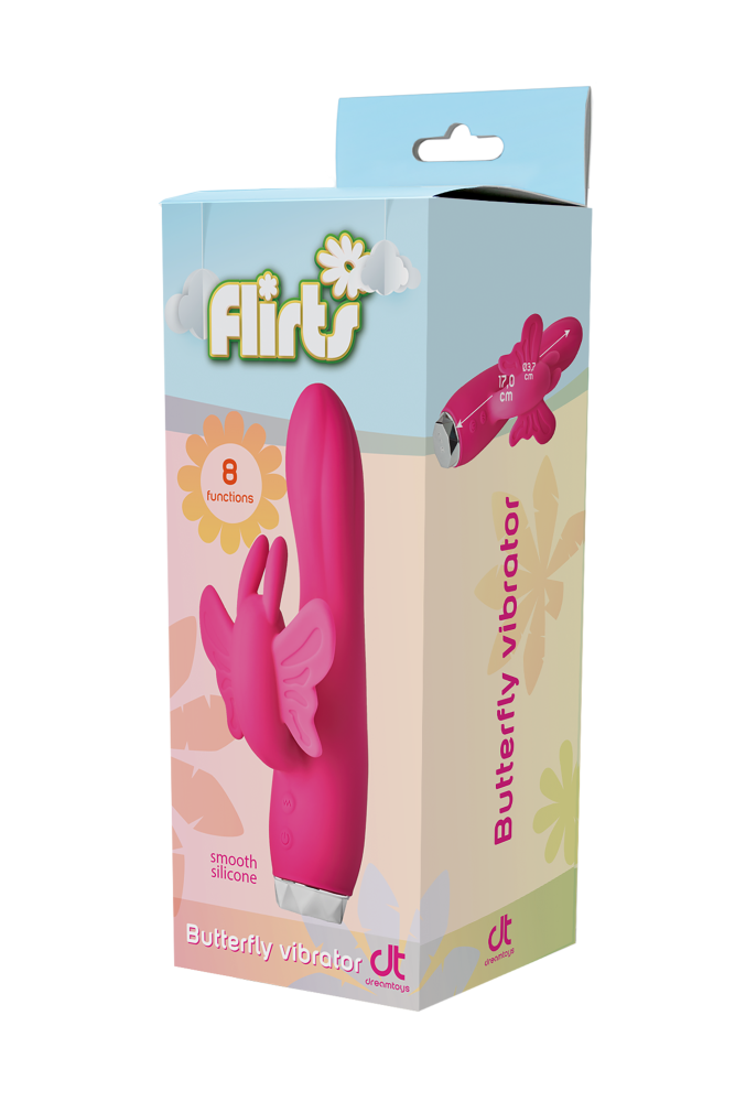 Flirts — это коллекция Dream Toys ярких цветов и упаковки, напоминающая о весне, голубом небе, солнечных днях и цветах. Этот вибратор-бабочка имеет 3 скорости вибрации и 5 ритмов. Бабочка стимулирует клитор и половые губы, в то время как точка G также может быть достигнута с помощью слегка изогнутого стержня. Вибрационная бабочка Flirts сделана из гладкого силикона, а управлять ею легко с помощью 2 кнопок. Для вибратора-бабочки требуются 2 батарейки ААА, которые не входят в комплект.