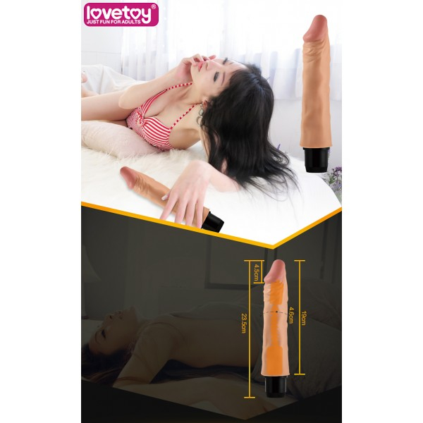 Гибкий вибратор телесного цвета из водонепроницаемого силикона. Идеально подходит для прелюдий и игр с партнером. Используется со смазкой на водной основе. Длина 24 см., диаметр 4 см. Работает от трех батарей типа ААА. Батарейки в комплект не входят.