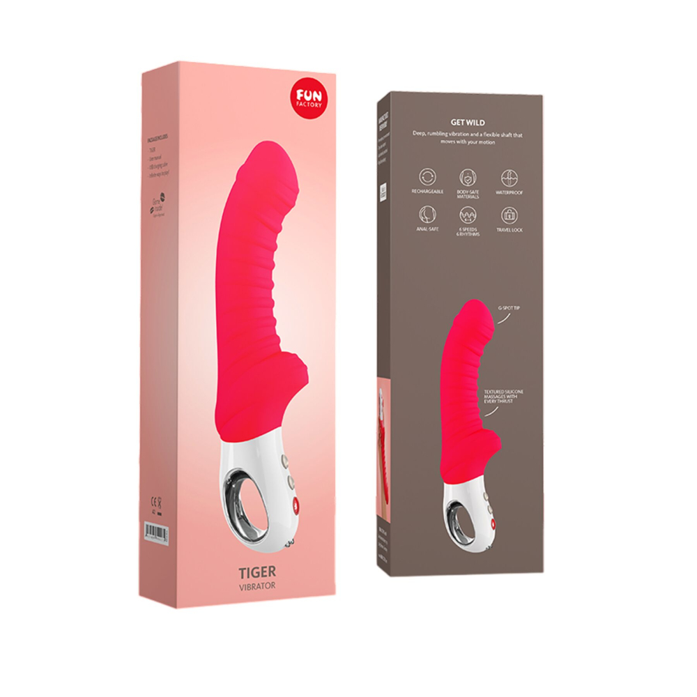 Если вы хотите ощутить внутри что-то большее чем обычный гладкий вибратор, рекомендуем купить вибратор для точки G Fun Factory TIGER. Его ребристая поверхность создает необычные волнообразные ощущения при каждом движении вибратора, а специальный выступ-стоппер дает возможность использовать его в том числе и для анальной стимуляции. Гибкий ствол комфортно размещается внутри, а изогнутый кончик точно попадает на точку G (или простату при анальном использовании). Мотор работает в 6 режимах и на 6 скоростях, создавая глубокие вибрации. Вибратор водостойкий.