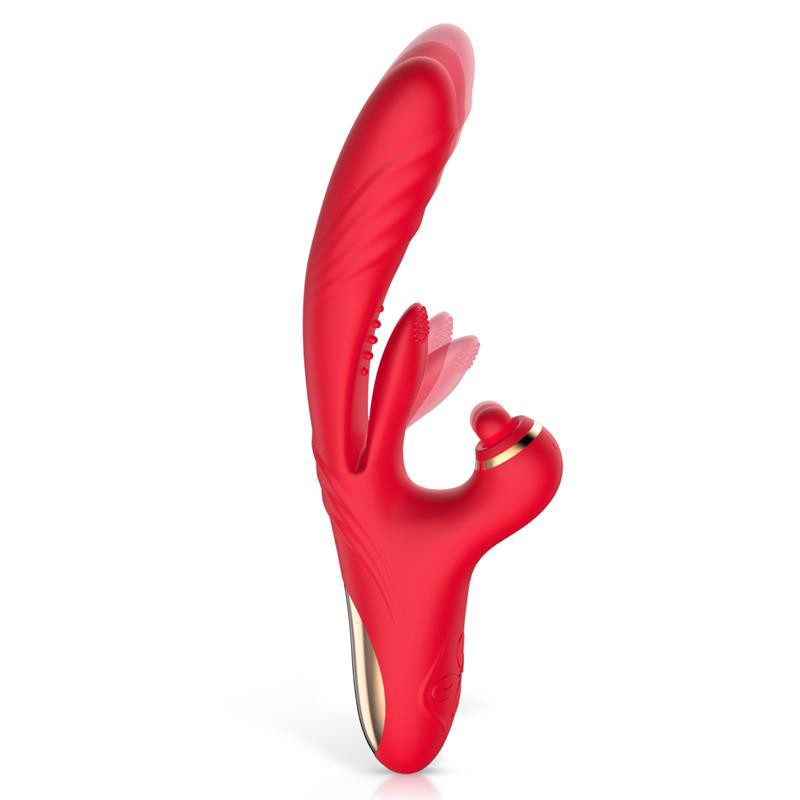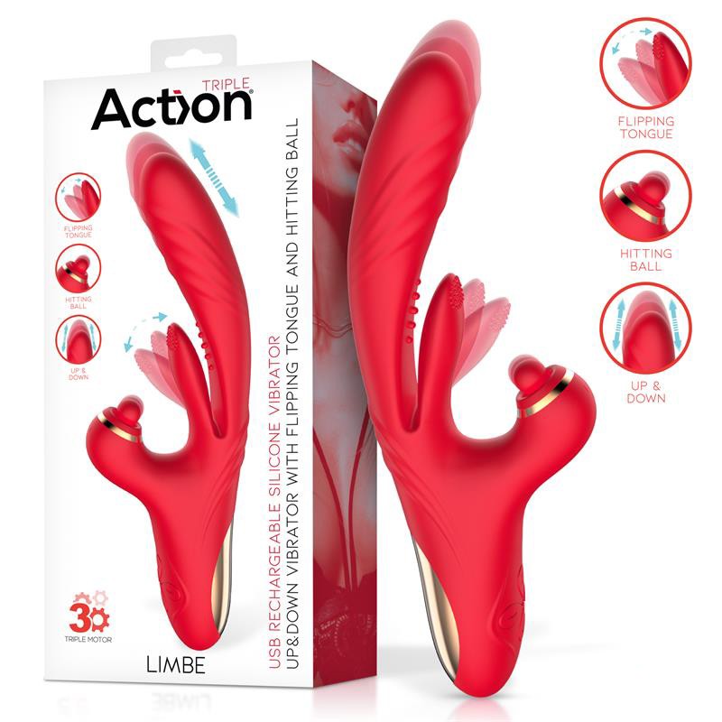 Вибратор тройной стимуляции вагинальный для точки G и отростком для клитора шариком красного цвета Action Limbe