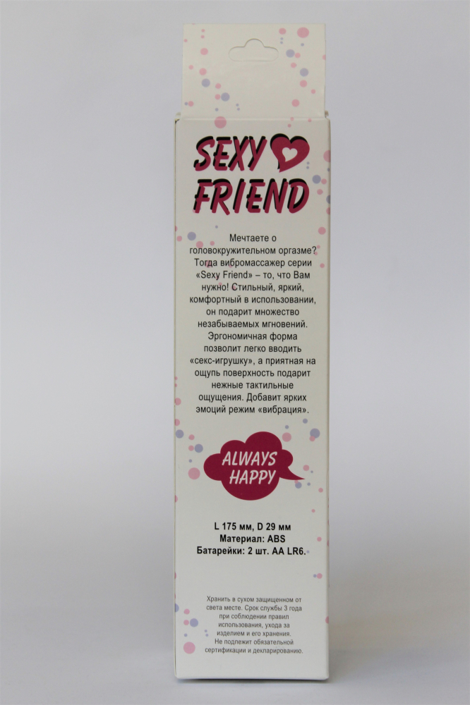 Ждешь головокружительный оргазм, тогда вибромассажер в яркой цветовой гамме из серии «Sexy Friend» - твой первый помощник в этом деле. Стильный дизайн порадует даже самую взыскательную натуру. Гладкий, приятный на ощупь массажер доставит множество приятных минут своей обладательнице. Режим "вибрация" сделает ласки более чувственными и незабываемыми. Длина этой секс-игрушки составляет 175 мм и 29 мм в диаметре. Изделие изготовлено из материала ПВХ, легкого в уходе. Для более комфортного использования вибратора рекомендуем приобрести специальный лубрикант. До и после каждого применения необходимо использовать очищающее средство для изделий интимного назначения.