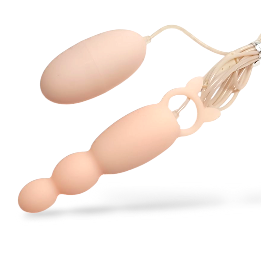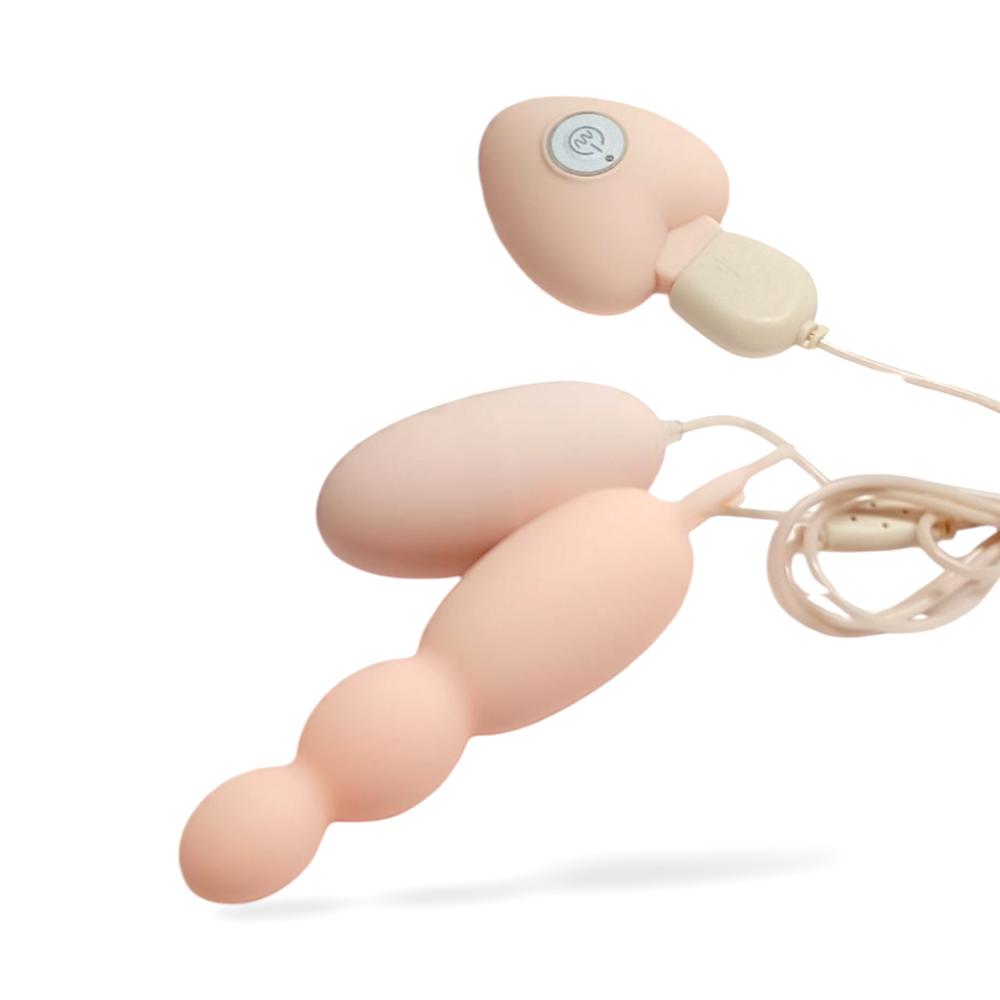 и нежного силикона, имеют проводной пульт управления в виде сердечка с кнопкой и специальным USB разъёмом. Очень стремительных 10 режимов вибрации исходят из каждого яйца. Мощные моторы работают безпрерывно 60 минут. Вибромассажёры работают синхронно от одного проводного пульта, с которым они соединены. Одно из яиц покрыто матовым силиконом, имеет рельефную форму и специальный хвостик кольцо для держания: подходит как для вагинальной так и для анальной стимуляции . Второе яйцо гладкое выполнено из матового пластика и очень мощно вибрирует. Используйте его для внешней стимуляции и не вводите внутрь.