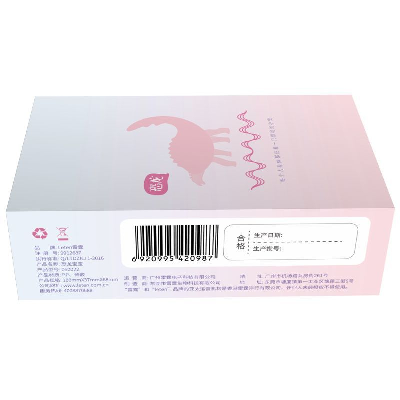 Предлагаем купить вибратор-яйцо Leten Dinosaur Baby Pink — невероятно милое, полностью покрытое мягким медицинским силиконом, с фигурным отростком для стимуляции клитора, дополнительными ребрышками и двумя моторами. Этот удивительный гаджет позволяет совместить приятное с полезным: получайте удовольствие и тренируйте вагинальные мышцы! Предусмотрено 10 режимов вибрации, но вы можете и самостоятельно выбирать ритм при управлении со смартфона.