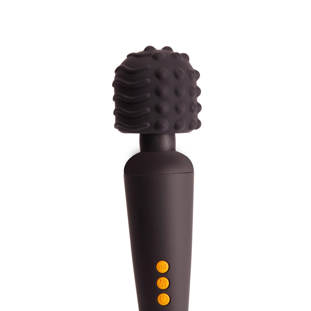 Все насадки изготовлены из мягкого матового силикона, им же покрыта головка массажера. Есть 20 режимов вибрации и 8 скоростей, которые вы можете сочетать 160-ю разными способами. Управлять вибратором очень просто при помощи выпуклых оранжевых кнопок с обозначениями: их легко найти на ощупь и заметить на черном фоне. Массажер перезаряжаемый при помощи USB-кабеля.
