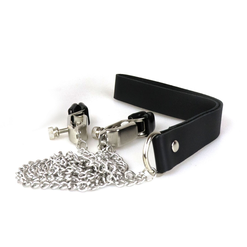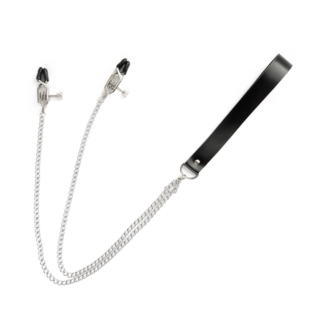 Зажимы для сосков с кожаным поводком на металлической цепочке. Это совершенно новый взгляд на привычные девайсы для жестких практик. Зажимы оснащены регуляторами, для изменения силы зажима по вашему вкусу. Ваш партнер может сделать стимуляцию сосков невероятно жесткой, максимально сжимая зажимы и тянув за поводок. Ничего подобного вы точно не пробовали раньше. Длина поводка достаточна для того, чтобы игры были разнообразными и принесли удовольствие всем участникам процесса. Дергать за поводок и получать в ответ стоны - самое сексуальное, что можно себе представить.