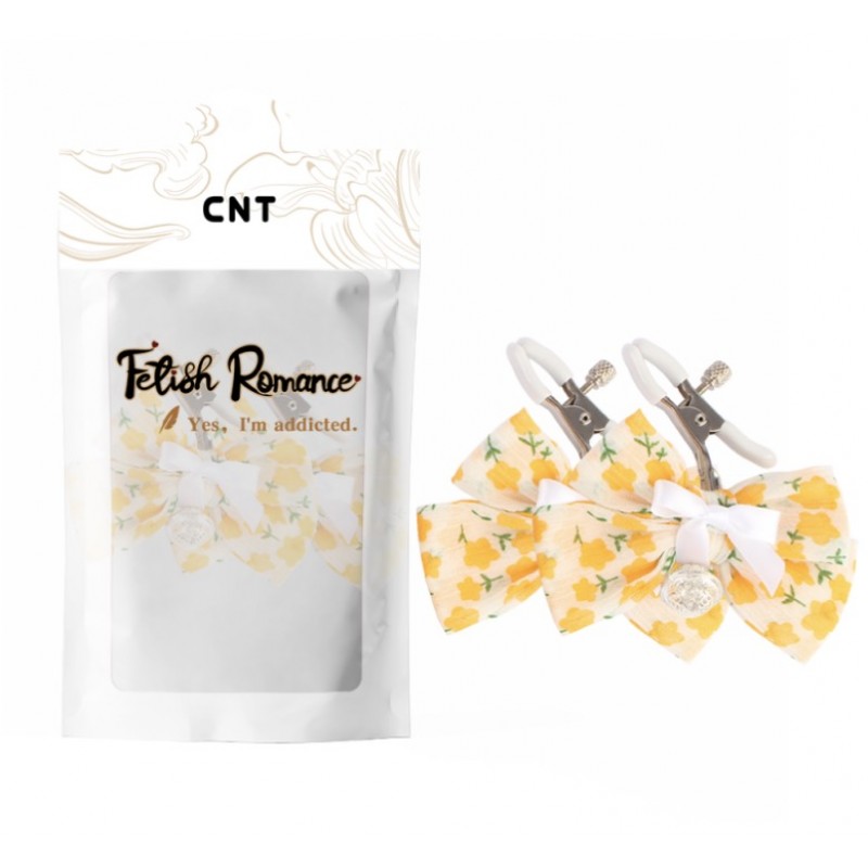 Зажимы для сосков БДСМ с силиконовыми наконечниками и белыми бантиками и желтым узором Cnt