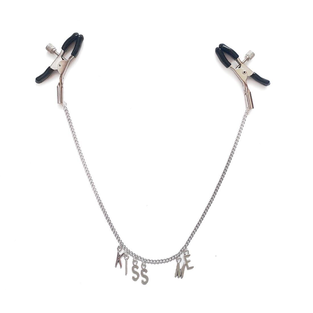 Зажимы для сосков на цепочке Art of Sex - Nipple clamps Kiss Me - Зажимы для сосков, которые скажут всё за вас. Металлические зажимы с силиконовыми накладками для безопасного использования, дополнительно оснащены регуляторами для изменения силы зажима на ваш вкус. Зажимы соединены между собой тонкой цепочкой с призывной подвеской Kiss me. С этими зажимами ваш партнёр поймёт любой намёк.