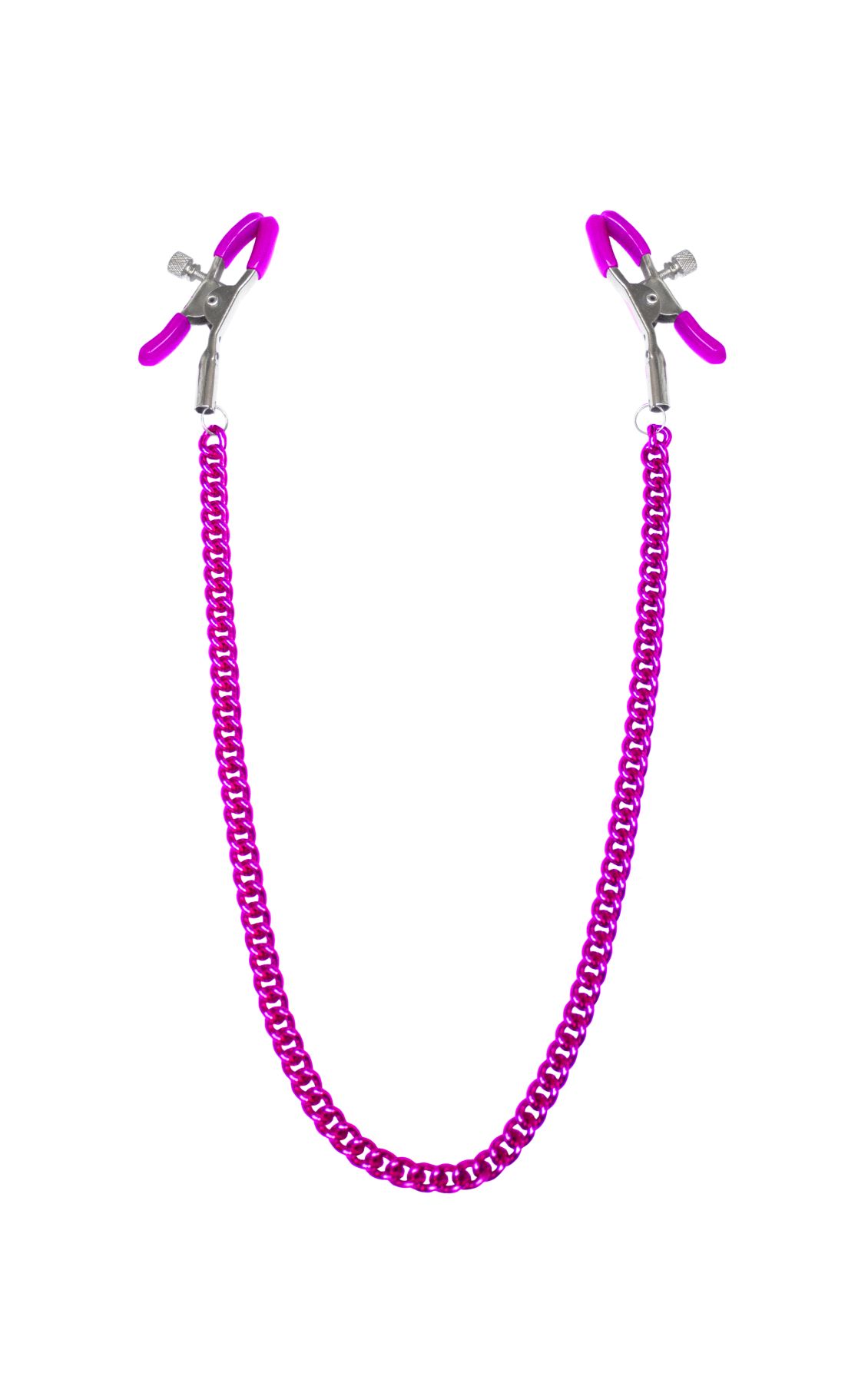 Классические зажимы для сосков, соединенные цепочкой, позволяет создать нужный уровень давления на сосок, а также — играть, потягивая за цепочку, давая ее в рот подопечной или прикрепляя к чему-то.