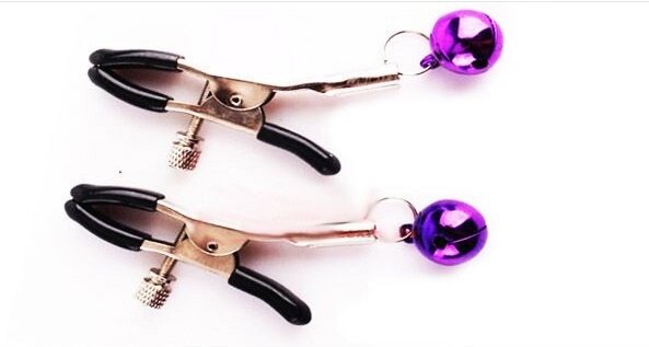 Зажимы на соски с бубенчиками. Зажимы работают по принципу прищепок. Они представляют собой клипсы из металла. Рабочая часть покрыта мягкой резиной, чтобы не травмировать нежную кожу на сосках. Степень сжатия плавно регулируется при помощи маленьких винтиков.
