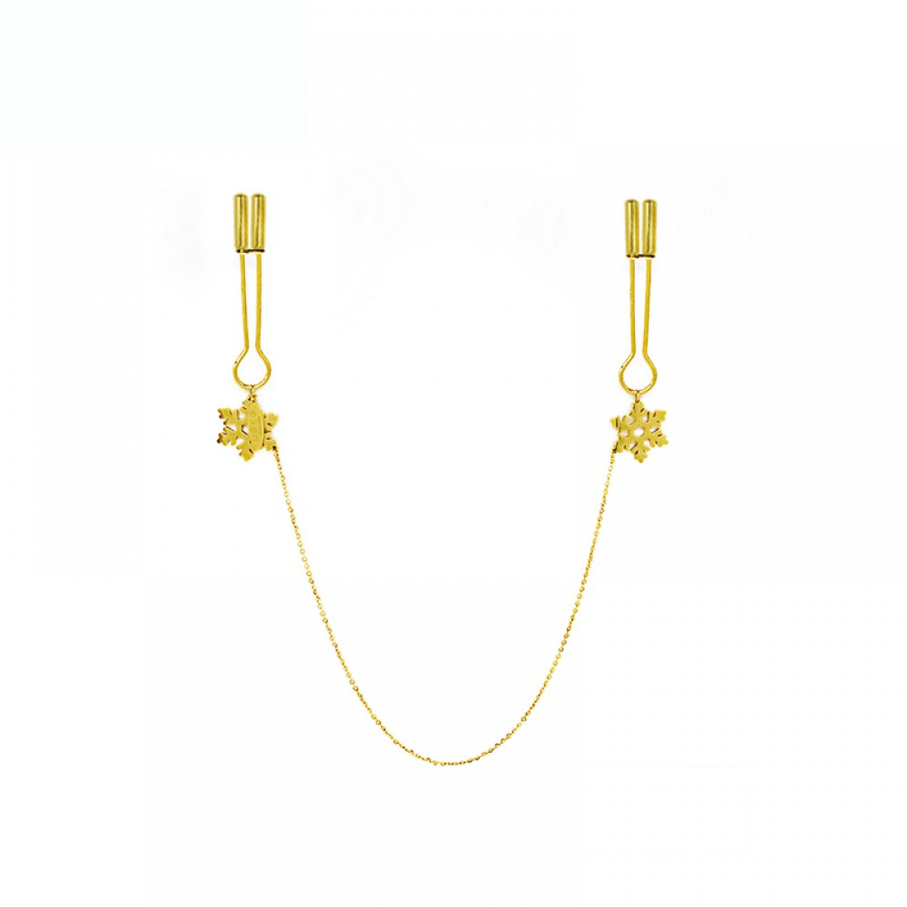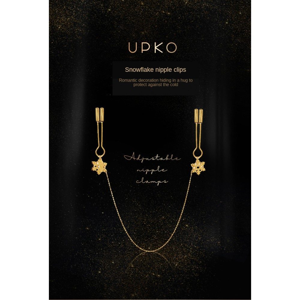 Зажимы для сосков от UPKO позволят вам раскрыть свою чувственность и повысить восприимчивость. Они подходят как для опытных ценителей, так и для новичков. Уникальная свисающая форма снежинки и медное покрытие с золотистым оттенком привлекают внимание. Зажимы позволят вам испытать сладкие ощущения от боли. Благодаря изысканному дизайну и продуманной форме они идеально подойдут к вам и выгодно подчеркнут вашу грудь. Сила давления на соски регулируется с помощью удобной скобки. Цепочка между зажимами цепляет взгляд и завораживает, вы точно будете в центре внимания! Но это не просто украшение, это спусковой крючок для эротической энергии. Цепочка поможет вашему партнеру контролировать ваши движения во время игры. Благодаря этим зажимам вы будете очень активно отзываться на ласки. Не отказывайте себе в таком удовольствии и войдите в круг избранных владельцев аксессуаров от UPKO!