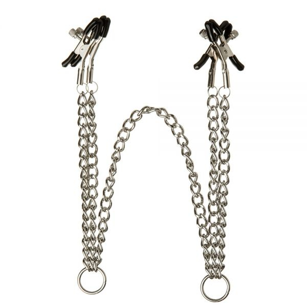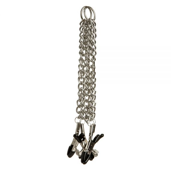 Набор черных металлических зажимов для сосков, каждый на металлической цепочке длиной 20 см, и прикрепленный зажим для клитора на металлической цепочке длиной 32 см.