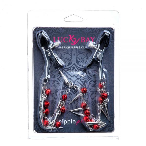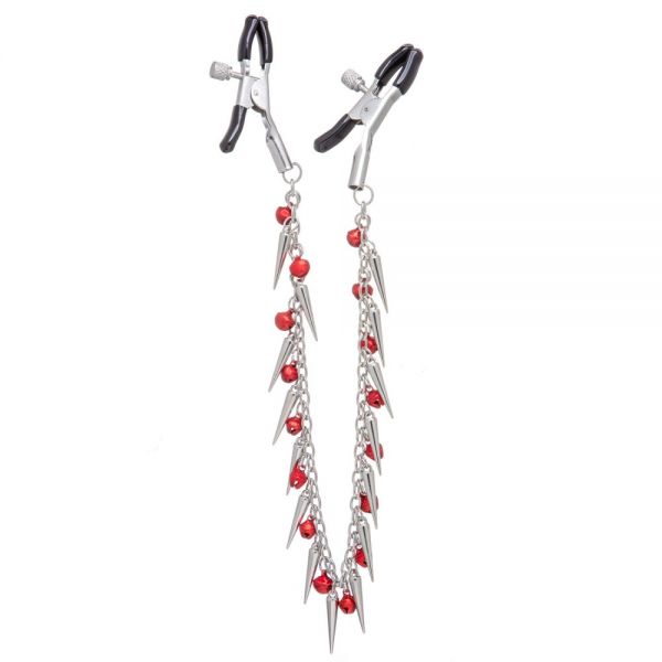 Металлические зажимы на соски покрыты мягкими красными резиновыми прокладками Nipple play Chain Red Bell and Spike