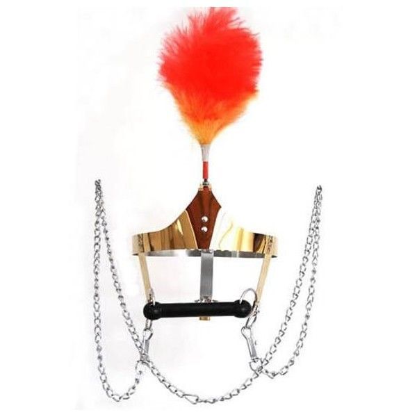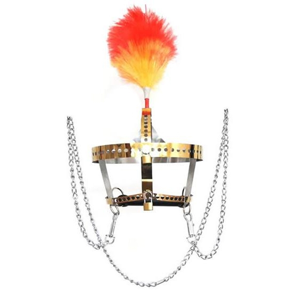Золотая стальная средневековая маска. Регулируемый резиновый крепитель под шеей. Украшена цепями и пером.